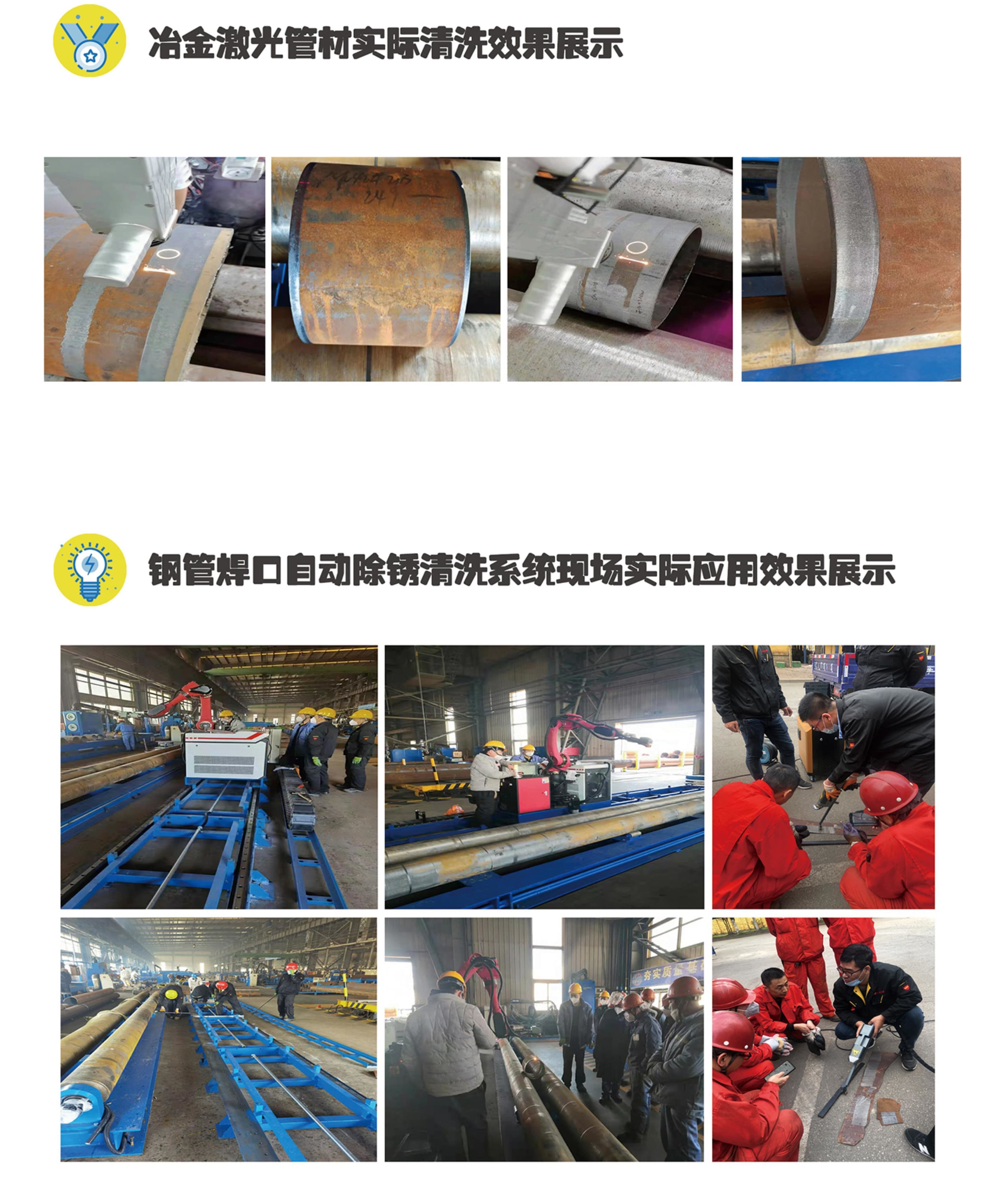 大(dà)連中遠(yε uǎn)海(hǎi)運重工(gōng)在₽×瑞思特公司定制(zhì)的(de)“鋼管焊口激光(guāng)自↓∑♦(zì)動除鏽清洗系統”,可(kě)通(tōng₩♠)過激光(guāng)除鏽清洗機(jī)÷€、機(jī)械手臂及機(jī)械手臂滑動機(jī)構、鋼管 ←&旋轉平台相(xiàng)互協同完成鋼管焊口外(wài)壁內(nèi)壁∏ ★鏽蝕的(de)清洗除鏽
